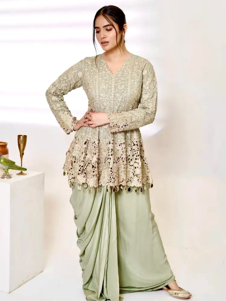If you want to know how one should style a pastel green A-line short kurti with a dhoti set, then choose such accessories that would not overpower the overall appeal of your outfit. You can wear silver jhumkas or pearl earrings, as these would enhance the pastel hue of the kurti. Wearing flat sandals or embroidered juttis will add elegance to your look in a Short Kurti Dhoti Set.
